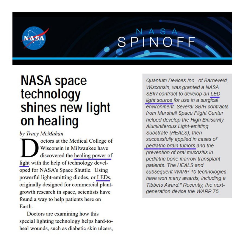 NASA is now using a conination green & red light LEDs to help astronauts heal in space because of research done on kids with transgenerational pediatric brain tumors.