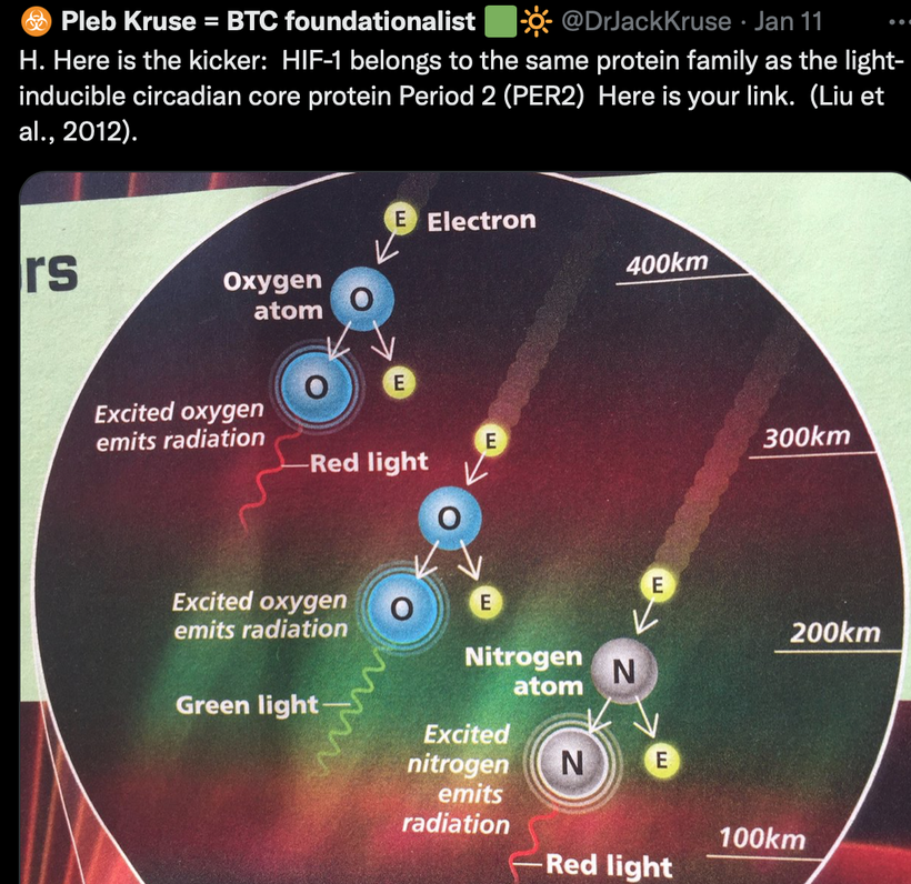 Core Hypothesis: nnEMF, ALAN, poor sunlight, and geoengineering damage melanopsin, mtDNA, and heme proteins everywhere to make oxygen a toxin, reducing DDW, dehydrating melanin, and increasing éR, leading to hypoxia, HIF-1α activation. The picture below makes the link of hypoxic Earth (GOE) to normoxic Earth of today. In the GOE version of Earth the Warburg metabolism was favored to prevent oxygen damage and this remnant of optical signaliing is seen in today’s Vasopressin-ISR-GDF15 axis activation by aberrent light. It is also deeply associated with Vitamin A liberation from opsins disrupting Rev erb alpha and beta and PER1/PER2. Excited oxygen in the early GOE atmosphere released red and green light from its interactions and these two colors of light became important for hemoglobin stabilization and destabilization when it came to carrying oxygen to and fro to supply mitochondria. This is shown on the slide below. You can also see how hypoxia induced factor 1 and the PER2 link.