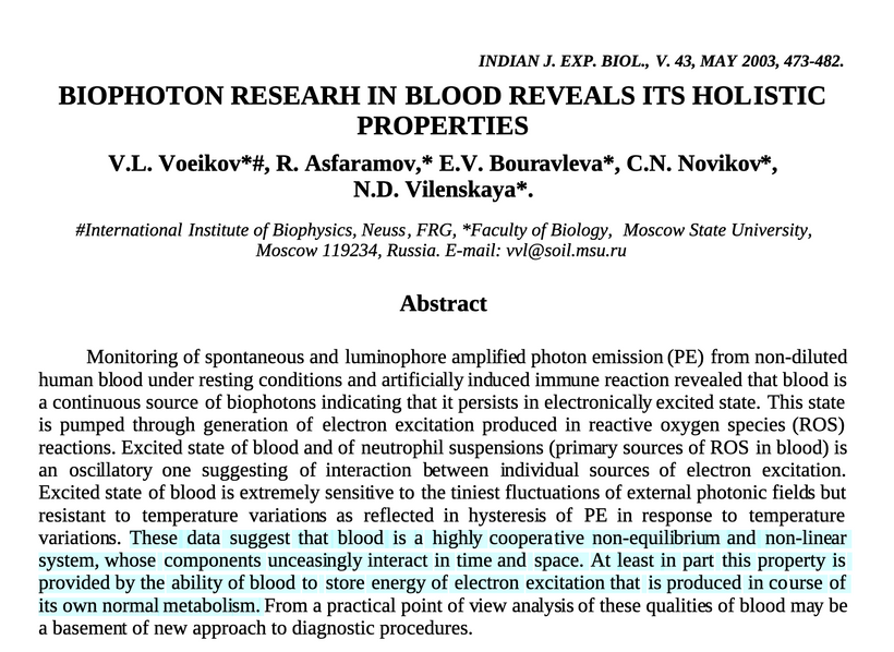 New Mechanism: Blood is a non-linear, cooperative system emitting biophotons via ROS reactions in heme proteins, sensitive to nnEMF/ALAN, which increase deuterium, widen biophoton spectra creating noise and reducing optical signaling, while disrupting regenerative currents (methemoglobin accumulation). Red light (drug equivalent per Tiina Karu), DDW, and methylene blue reduce deuterium, ROS, and methemoglobin, restoring ultraweak UV biophotons and lowering éR in tissues making oncogenesis less probable.