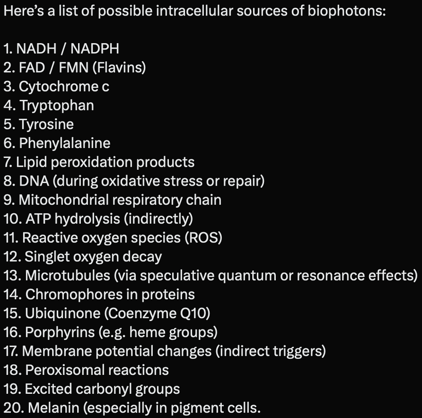 The addition of the biophoton research on red blood cells (RBCs) and blood from the 2003 study “Biophoton Research in Blood Reveals Its Holistic Properties” by Voeikov et al. provides a critical layer to my photo-bioelectric hypothesis. This study highlights blood as a continuous source of biophotons, reflecting its electronically excited state driven by reactive oxygen species (ROS) reactions, and its role as a highly cooperative, non-equilibrium, non-linear system. Since RBCs have no mitochondria it should be surprising to new students of my work that blood can easily create biophotons since mtDNA is usually needed to make ROS and electronic states to transform matter to produce biophotons. This paper aligns with my existing framework, which emphasizes light-driven metabolism (Light > Food), the role of water dynamics, deuterium effects, and evolutionary adaptations post-K-T Extinction on Earth. It would be wise for me to remind you that human adult blood is loaded with deuterium. How does this square with my thesis?