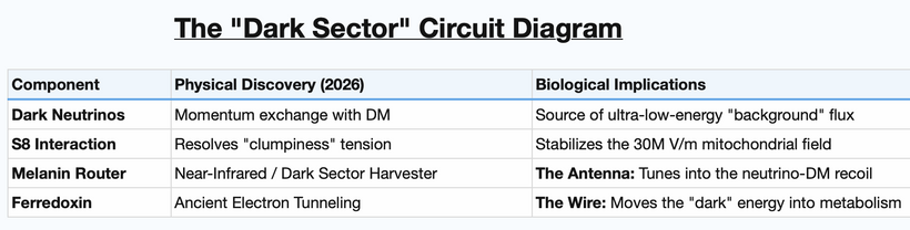 If neutrinos (which usually pass through matter) are interacting with dark matter, they are no longer “ghost particles”, they become active participants in the energy gradient. The specific 0.66 eV bandgap in melanin is critical because it defines the specific energy barrier required to capture the recoil or “scatter” from these dark-matter-neutrino interactions. While modern science uses massive underground vats to find neutrinos, my model suggests that melanin-wrapped [Fe-S] clusters are nature’s own “dark sector” detectors, capable of harvesting the energy released when neutrinos collide with the dark matter halo surrounding Earth.