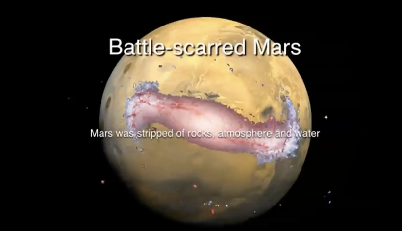 On Mars: Mars’ core cooled 4.1 billion years ago, halting its magnetic dynamo. Solar wind stripped its atmosphere, leaving iron oxides on the surface, a testament to it history of energy depletion.
